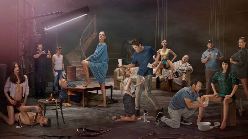 Charlotte Gainsbourg (rechts) op de stoel, Christian Slater (aan de waskom), Willem Dafoe (midden met drinkbekers) op de knieën Sophie Kennedy Clark, , Uma Thurman (midden links in blauwe jurk), Udo Kier (onder de tafel) Stellan Skarsgard en Mia Goth (op de bank), links op achtergrond regisseur Lars von Trier met tape op zijn mond vanwege zijn gelofte van stilte naast hem Jamie Bell, , Connie Nielsen (uiterst rechts met open jas), (links) Stacy Martin op Shia LaBeouf, Nicolas Bro rechts met zwart petje...